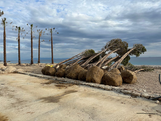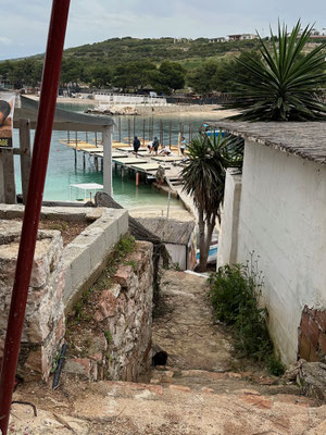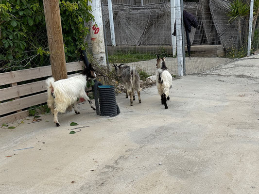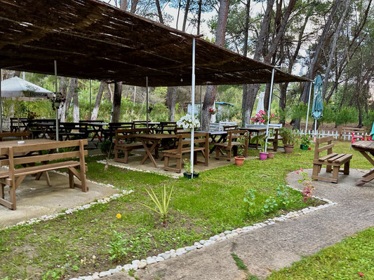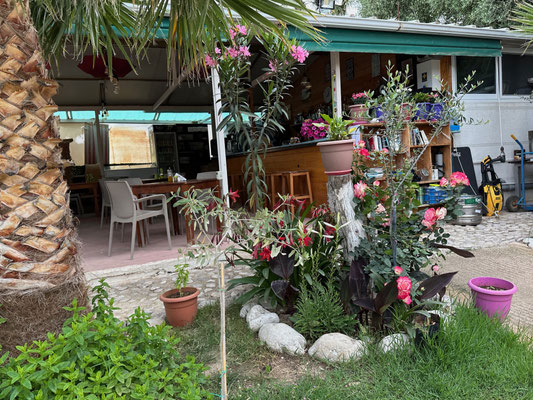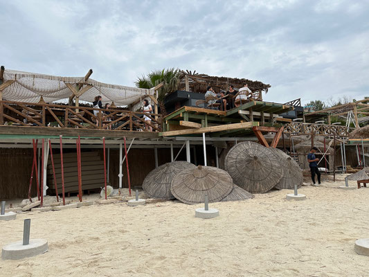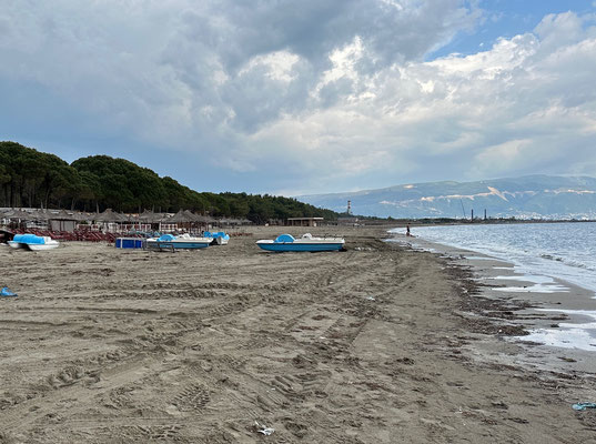 Am Strand am Meer befindet sich ein Strandrestaurant neben dem anderen, momentan ist alles noch geschlossen bzw. wird hergerichtet. In der Saison wäre das sicherlich nichts für uns. Aber jetzt passt’s schon. Am ersten Pavillon fragen wir nach einem Kaffee und klar gibt’s einen, auch wenn noch nicht geöffnet ist. Der junge Sohn lernt Englisch in der Schule und darf das direkt mit uns üben. Klappt schon prima.