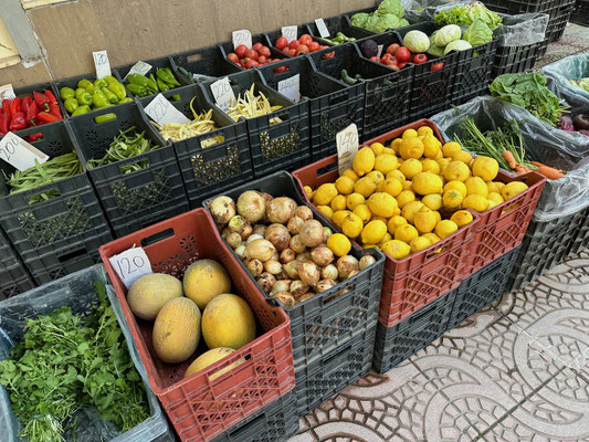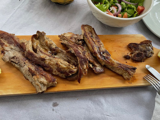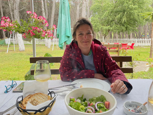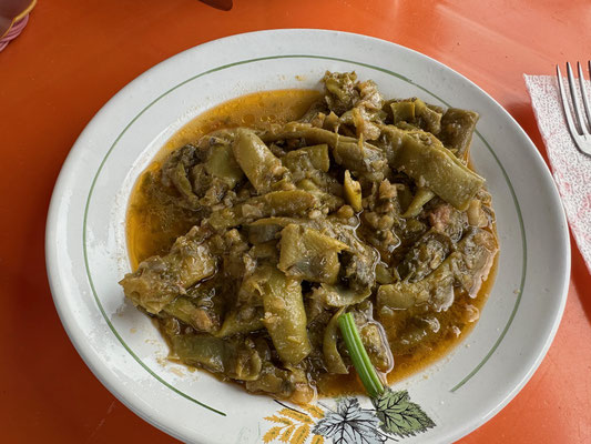 Direkt neben dem Camping befindet sich ein Lokal und da wollen wir mal gucken, was es dort zum Essen gibt. Die ältere Dame ist sehr freundlich, unsere händisch-füssisch Kommunikation klappt super. Wir bekommen ein kleines Tellerchen zum Probieren und bestellen daraufhin zweimal leckeren Bohneneintopf, dazu einen Salat.