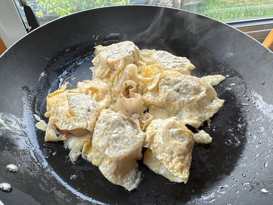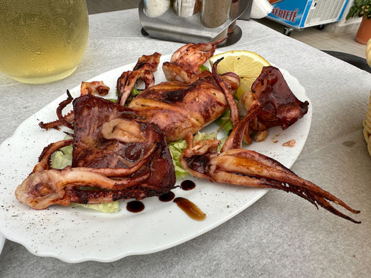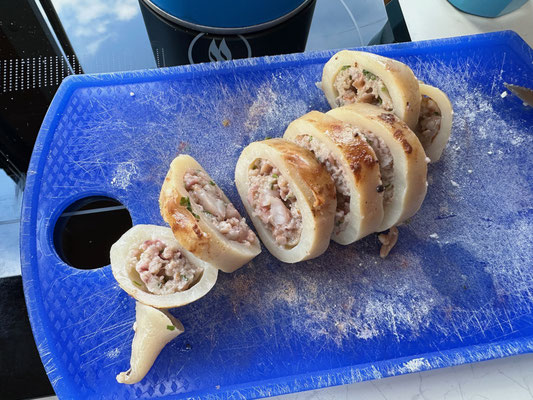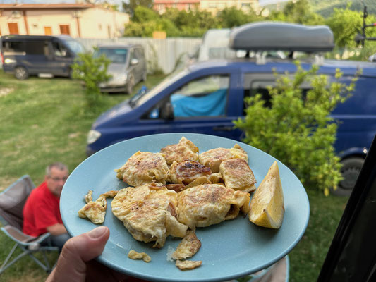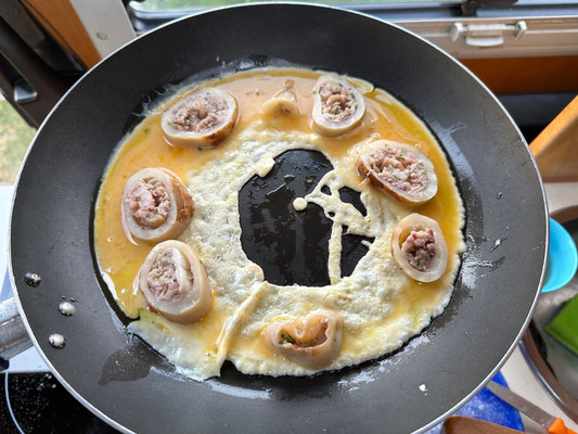 Später gibt’s zum Abendessen dasselbe, wie gestern. Da waren die Portionen so groß, dass wir heute glatt von dem Mitgenommen noch einmal satt werden. Beim gefüllten Calamar erinnern wir uns an ein Gericht, welches wir auf einem Markt in Südkorea gegessen haben. Hierzu wird der Calamar in Scheiben geschnitten und mit Ei in der Pfanne gebraten. Das lässt sich auch ganz einfach im Wohnmobil zubereiten.