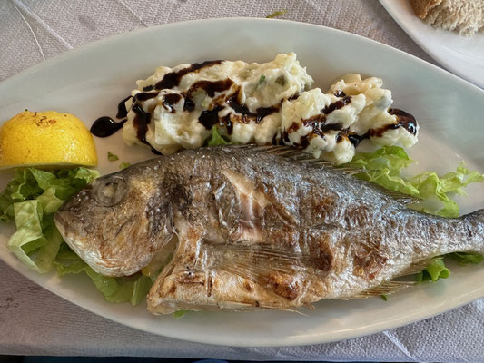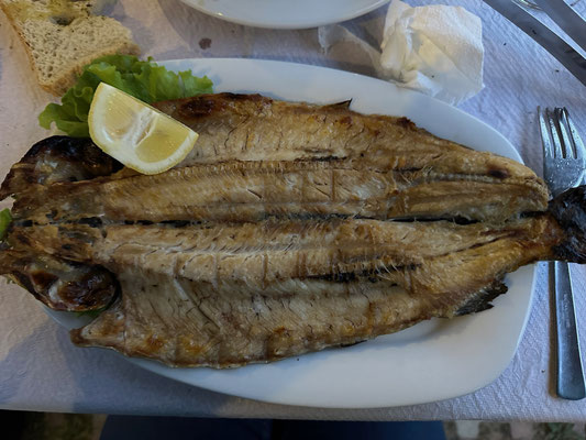 Wir entscheiden uns für das neue Kaço Fish Restaurant, welches draußen einen netten Biergarten hat. Die beiden Kellner sind ein wenig irritiert, dass wir bei dem Wetter draußen sitzen wollen, dabei ist’s ja lediglich kalt und nicht nass draußen. Wir bestellen gefüllten Tintenfisch und einen Grillteller und bekommen vorab als Gruß des Hauses ein Teller eingelegte Sardinen. Unglaublich lecker. Gleiches gilt auch für unsere bestellten Hauptgerichte. Die Teller sind beide übrigens so groß, dass ich der festen Überzeugung bin, dass wir bestimmt aus Versehen einfach die doppelte Portion bestellt haben. Klingt erst mal abwegig, aber unsere Bestellung war schon lustig. Wie wir später beim Bezahlen feststellen, war es tatsächlich nur jeweils eine Portion. Na gut, wir haben jetzt noch ein weiteres Essen für morgen :-)