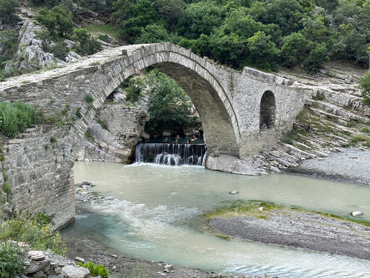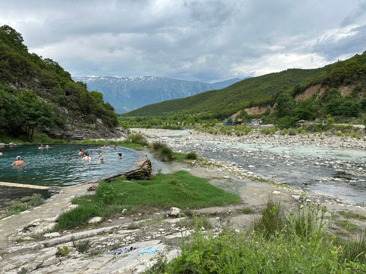 Zu Fuß ist man auch von hier in fünf Minuten an den Thermalbecken. Über eine alte, hübsche Steinbrücke geht’s einmal auf die andere Flussseite und dort befinden sich dann zwei Becken zum Planschen bzw. gemütlich rumsitzen. Ein kleineres direkt am Fuß der Brücke und ein größeres ein Stückchen weiter. Beide sind gut belegt und nicht ganz so warm wie gedacht. Macht nichts, wir wollen ja nicht mehrere Stunden hier verbringen. Der Blick in die Berge ist schon klasse. Leider scheint das Wetter auch heute nicht ganz so stabil zu sein und als es wieder mal grummelt, machen wir uns schnell auf den Weg zu unserem Womo.