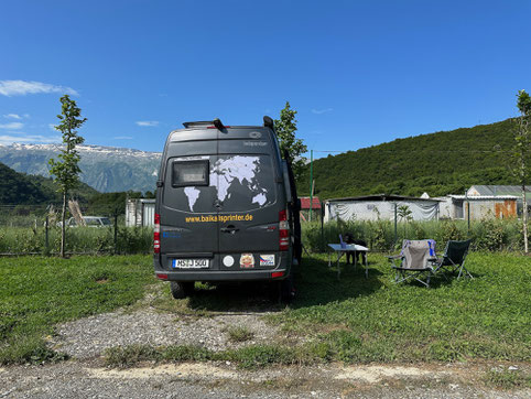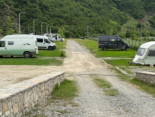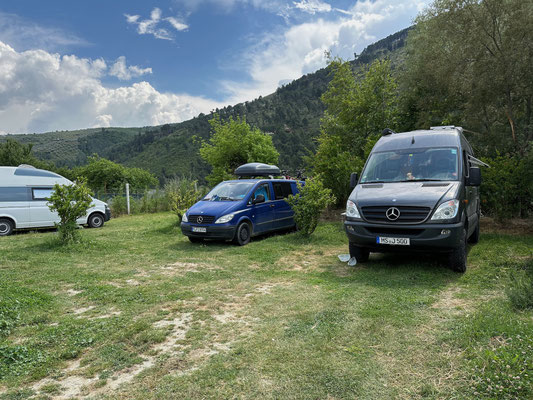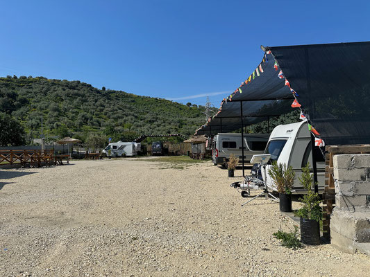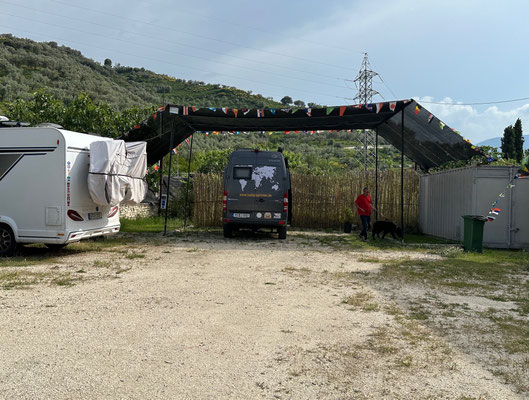 Und so landen wir ein paar Stunden später wieder in Berat und entscheiden uns diesmal auf dem Castle Camping Berat zu übernachten. Dieser liegt genau auf der anderen Seite des Ortes als Niko Camping und wie der Name schon sagt, ist’s nicht ganz so weit hoch zur Burg von Berat. Der dieses Jahr neu eröffnete, kleine Campingplatz hat nicht nur Stellplätze für Wohnmobile bzw. Wohnwagen, sondern auch eine Zeltwiese. Die Begrüßung ist auch wieder sehr freundlich, es wird Englisch gesprochen und wir stellen uns auf den Platz vor Kopf. Die Stellflächen sind mit schattenspendender Plane überdacht, bei den aktuellen Temperaturen für uns weiterhin nicht wirklich notwendig, auch wenn es sich so langsam doch nach Sommerurlaub anfühlt.
