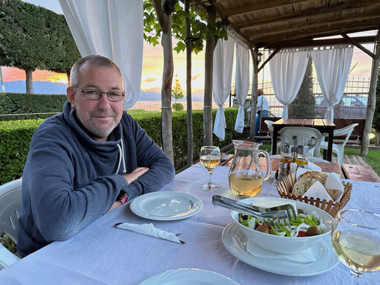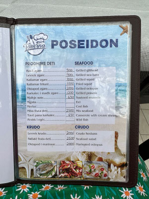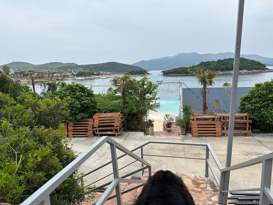 Über die Strandpromenade ist’s rund ein Kilometer bis zum zentralen Sandstrand von Ksamil. Die meisten Restaurants haben noch nicht geöffnet, aber man sieht dass überall gearbeitet wird. In der Poda Beach Bar nehmen wir erst mal ein kaltes Getränk, bevor wir dann abseits vom Wasser uns ein Restaurant suchen. Die Terrasse vom Poseidon ist leer, aber es sieht geöffnet aus und die Speisekarte sieht gut aus. Und so werden wir freundlich begrüßt, Vanja ist kein Thema, und so genießen wir unseren ersten Abend in Albanien mit gegrilltem Calamar, überbackenem Käse und leckerem Salat. So kann es weitergehen in unserem Urlaub.