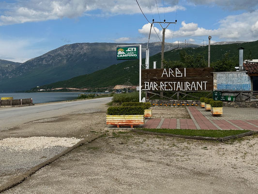 Am östlichen Ortsrand befindet sich Camping Arbi, nur zwei Kilometer von der nordmazedonischen Grenze entfernt. Ein Rasenplatz, sehr hübsch angelegt, mit grüner Hecke ringsherum und unweit vom See. Hier lässt sich der Tag gut ausklingen.