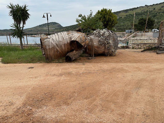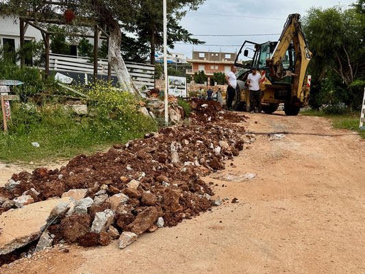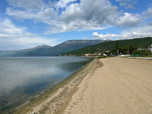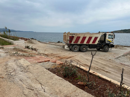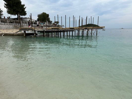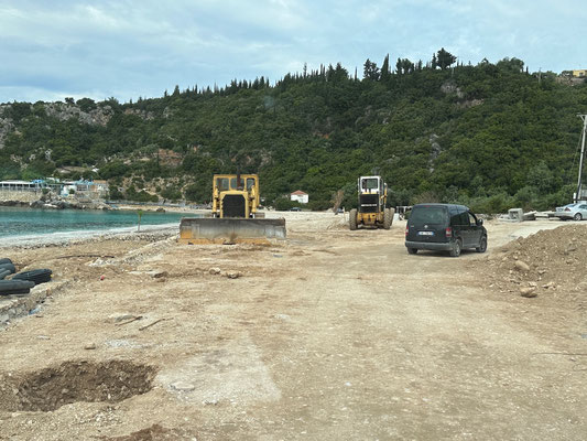 Zurück geht’s durch Ksamil und dann immer die Hauptstraße entlang, einmal an Saranda vorbei und weiter gen Norden. Es lässt sich gut hier fahren, es ist nicht viel los und alles in allem gemütliches Tempo, keine Raser, mal wieder ein paar Schafe und Ziegen und dann sind wir auch schon am Abzweig zum Campingplatz. Links abbiegen, drei Kehren bergab fahren und schon stehen wir in einer Baustelle. Wir hatten vorab schon gelesen, dass hier gerade eine neue Strandpromenade gebaut wird.