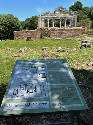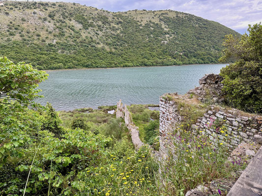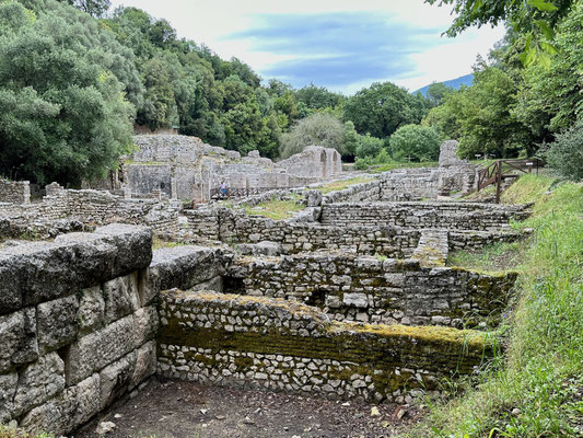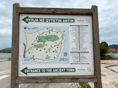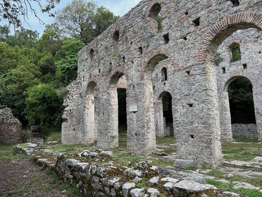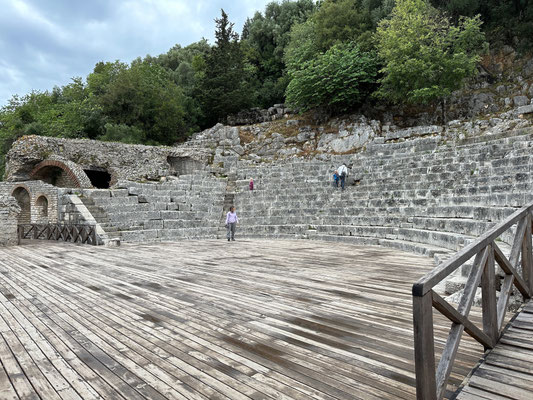 Zuerst stärken wir uns aber beim Bäcker mit einer gefüllten Teigtasche und fahren zur Ausgrabungsstätte Butrint zurück. Nachdem es hier gestern Mittag ziemlich voll war, sind wir mal lieber etwas früher da. Das ganze Gelände liegt auf einem bewaldeten Hügel, auf Lichtungen sind dann die alten Gemäuer zu finden. Angefangen vom Theater über Teile einer Basilika und diverse andere Gebäude des früheren Butrints. Die Hinweisschilder sind durchgehend in Albanisch und Englisch, so dass auch wir verstehen was wir da eigentlich sehen. Oben auf dem Hügel befindet sich im venezianischen Kastell noch ein Museum, welches wir aber nicht besucht haben. Alles in allem eine interessante Anlage.