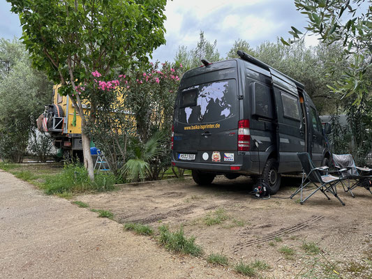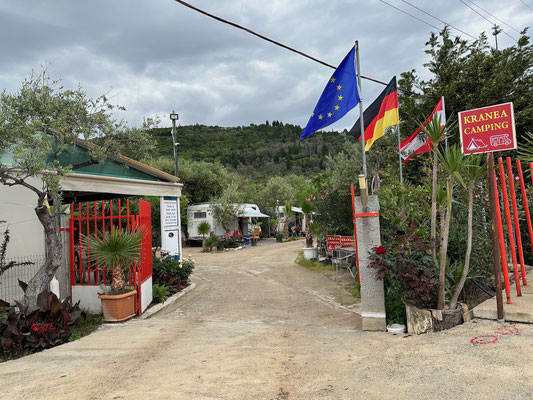 Und so warten wir kurz bis der Bagger den Erdhaufen abtransportiert hat und stehen kurz darauf vor dem Camping Kranea. Sehr hübsch angelegter Platz, wir stehen unter Olivenbäumen zwischen schattenspendenden Hecken und die Oleander blühen. Wir haben übrigens Glück, dass wir noch einen Platz bekommen haben. Hier ist momentan auch eine Reisegruppe mit ihren Wohnmobilen zur Übernachtung. Uns war gar nicht bewusst, dass es auch geführte Womo-Reisen hier auf dem Balkan gibt. Aber warum auch nicht. Und dank dieser Reisegruppe ist hier heute Abend Grillabend, an dem auch die anderen Gäste des Campings teilnehmen können. Da wissen wir doch schon mal was wir heute Abend machen.