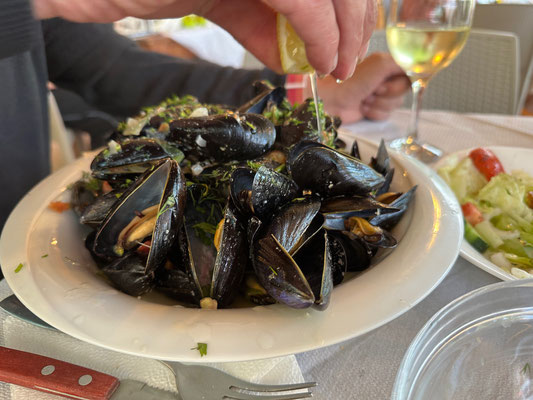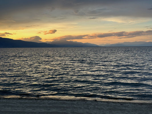 Wir spazieren mit Vanja am Strand entlang. Allerdings findet sie ja Kiesstrand irgendwie doof, da scheinen vier Pfoten nicht besser als zwei Füße zu sein. Später wird der große Grill am Platz angeworfen und gefühlt der komplette Platz versammelt sich an den Tischen. Zur Erweiterung bringen Einige noch ihre eigenen Tische und Stühle mit. Wir entscheiden uns für Fisch vom Grill, liebäugeln kurz mit den Grillwürstchen, nehmen als zweites dann aber doch die Muscheln von der normalen Karte. Beides wirklich sehr lecker und ein netter Abend hier am Platz.