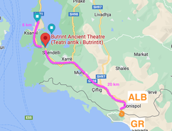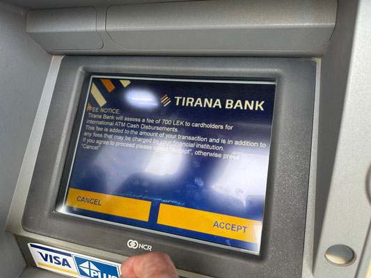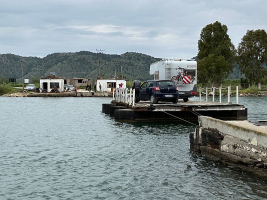 Um auf die Halbinsel nach Ksamil zu kommen ist die Nutzung einer kleinen Ponton-Fähre notwendig (Butrint ferry Lage). Hier passen je nach Größe grob eine Handvoll Fahrzeuge drauf, wir waren zu zweit, da nicht mehr warteten und innerhalb von fünf Minuten ist man auf der anderen Seite. Ankunft ist direkt am Parkplatz von der Ausgrabungsstätte Butrint im gleichnamigen Nationalpark. Die haben wir uns für morgen vorgenommen. Heute wollen wir erst einmal im „neuen“ Land Albanien ankommen, d. h. wir brauchen erst einmal Geld und SIM-Karten.