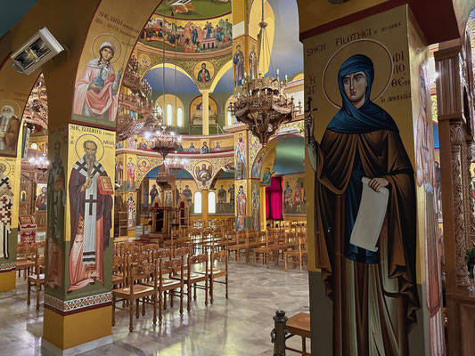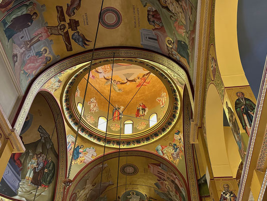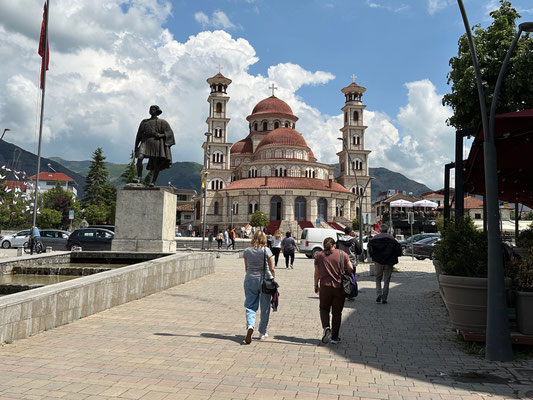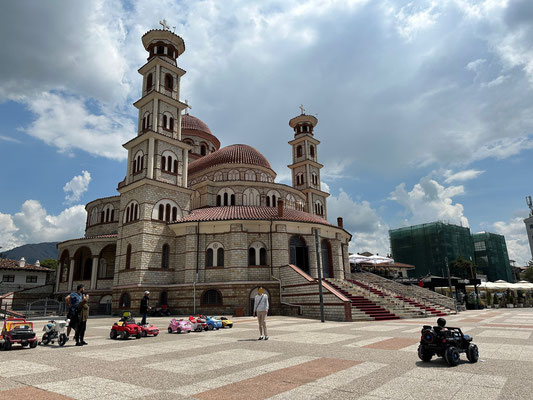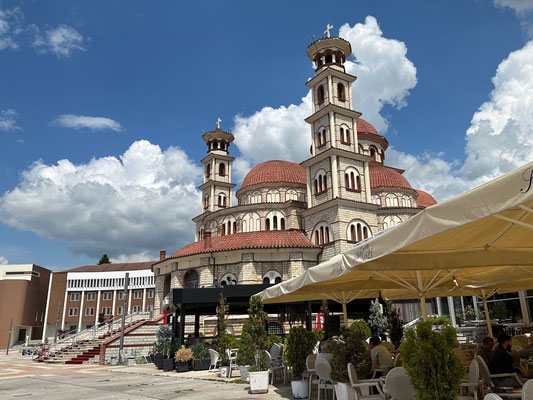 In Korça angekommen, fahren wir zur Kathedrale und bekommen sogar direkt einen Parkplatz davor. Laut Straßenschild benötigen wir einen Parkschein, aber ein Parkscheinautomat ist nicht in Sicht. Dafür zwei Typen die mit Zetteln rumlaufen und das sind nicht wie zuerst gedacht Lose, sondern Parkscheine. Die Auferstehungskathedrale "Ringjallja e Krishtit" (Lage GoogleMaps, Wikipedia) wurde nach dem Umsturz in Albanien neu gebaut und erst 1995 eröffnet.