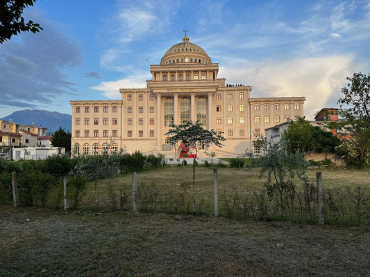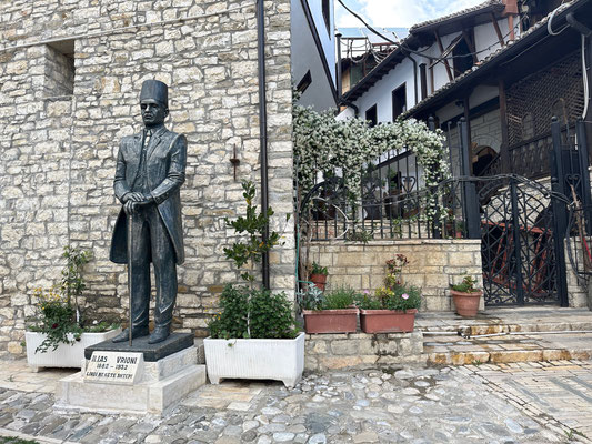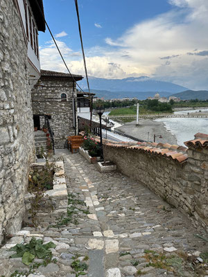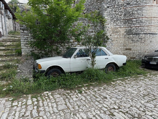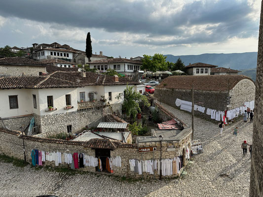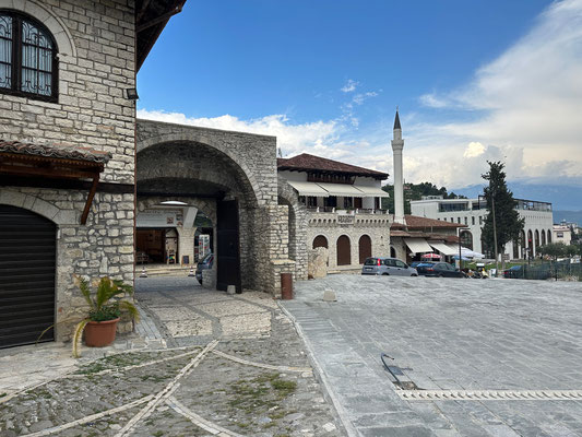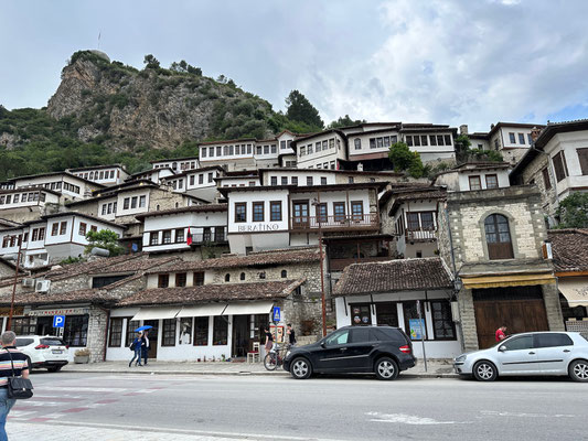 Unweit von Nikos Campingplatz liegen nicht nur die historischen Altstadtviertel mit ihren hübschen Häusern, sondern auch das imposante Gebäude des Hotel Colombo. Hierzu hatten wir Anfang des Jahres bei Galileo eine Reportage gesehen, welches auch bei Youtube zu sehen ist: „Alleine in einem 5 Sterne Palast: "Galileo"-Reporter Christoph Karrasch macht Urlaub in Albanien!“, Youtube, 15.02.2023). Wir schlendern durch die Gassen von Berat, ein wirklich hübscher Ort.