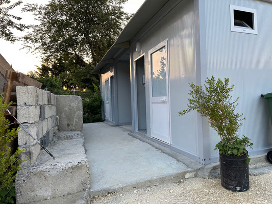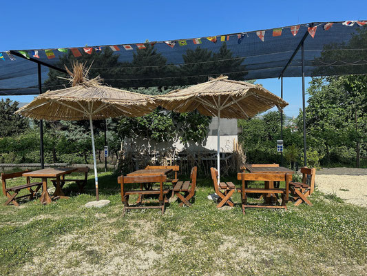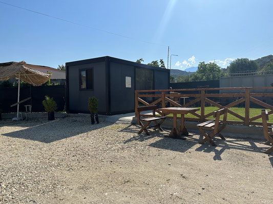 Als wir zur Mittagszeit ankommen werden wir freundlich von Niko begrüßt und finden ein nettes Plätzchen im Garten – momentan sind wir drei Transporter hinter dem Haus. Später am Abend sind es sechs Fahrzeuge insgesamt. Wir sind ganz froh, dass wir hinten stehen, der Verkehr auf der Hauptstraße vor der Tür ist nicht wirklich ruhig. Es gibt ein kleines Sanitärhäuschen mit Toilette und Dusche, dazu auch Strom für die Wohnmobile Im vorderen Teil des Gartens befindet sich eine überdachte Terrasse, wo man morgens frühstücken kann. Das wollen wir uns nicht entgehen lassen und bestellen direkt Frühstück für morgen früh. Da Niko alles selbst macht und er zeitgleich nur zwei Tische bedienen kann, wird einfach nacheinander gefrühstückt. Wir sind morgen gegen halb 10 dran, das passt für uns im Urlaub sehr gut.