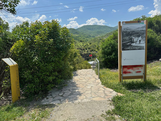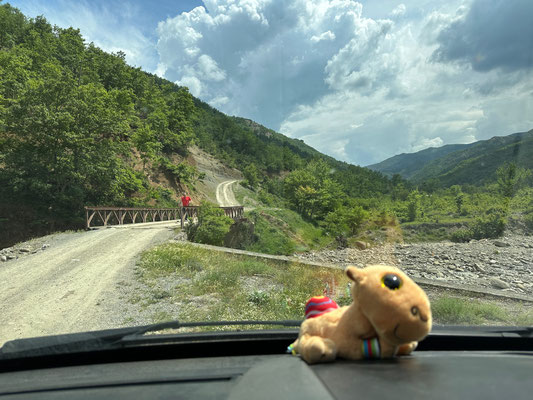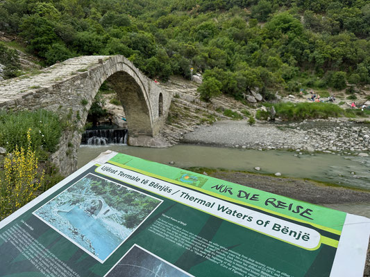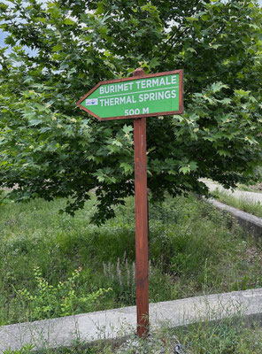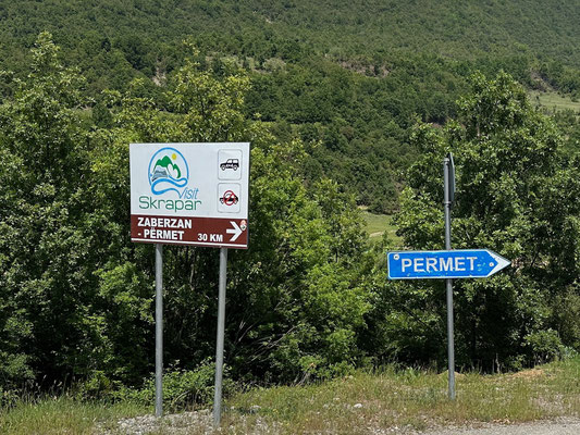 Wir fahren noch ein Stückchen weiter, bis zum Abzweig nach Permet (Lage GoogleMaps). Hinter Permet liegen die Thermalbecken Llixhat e Bënjës, in denen wir gerne baden wollen. Vom Abzweig sind nur noch 4x4 Fahrzeuge auf der Piste zu gelassen, das ist auch unübersehbar ausgeschildert. Wir fahren ein Stückchen rein, beschließen dann aber, dass das dann doch nicht so unser Ding ist und drehen wieder um.