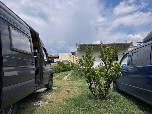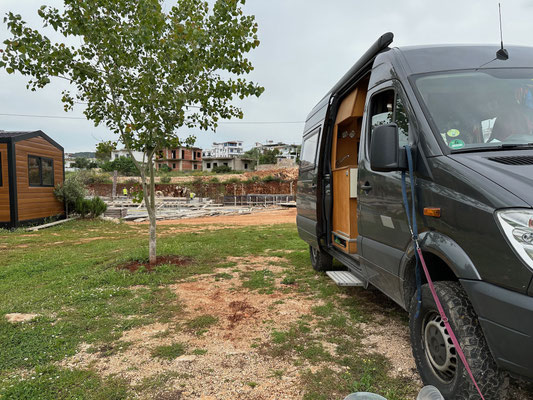 Die Suche nach einem passenden Campingplatz gestaltet sich danach ein wenig aufwändiger. Der von uns favorisierte Ksamil Caravan Camping erwartet ausgerechnet heute eine Gruppe. Wir hatten dies vorab auf deren Webseite gelesen, hatten aber doch die Hoffnung, dass für uns noch ein Eckchen frei ist. Schade. Der schräg gegenüber liegende Gaci’s Camping Ksamil ist voll, das war ja auch fast zu erwarten. Dafür hat Camping Sunset aber einen freien Platz für uns (vom nebenan liegenden Finn’s Camping ist nicht mehr viel übrig). Hier wird allerdings gerade gebaut, wie anscheinend überall gerade. Wir sind an zig Neubauten und Baustellen vorbeigekommen.