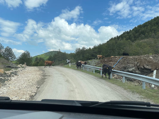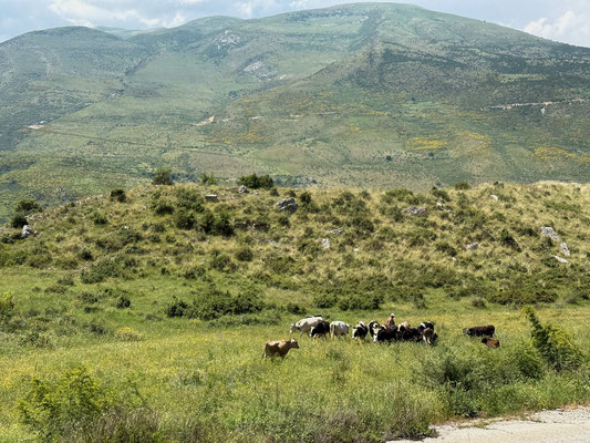 Zunächst geht’s die SH75 gen Süden. Wir wechseln ein Stück auf die SH80, welche bis zur griechischen Grenze führt und deutlich angenehmer zu fahren sein soll, um dann über die SH65 bei Leskovik wieder auf die SH75 zu kommen. Bis dahin ist die Strecke wirklich in Ordnung, erst danach fahren wir über eine aus unserer Sicht ganz passable Piste. Landschaftliche tipptopp, immer wieder hoch und runter, wenig Verkehr, dafür viele Schafe und Kühe. An einigen Abschnitten ist Baustelle, hier werden am Straßenrand gerade Kabel verlegt. Allrad oder Schwindelfreiheit ist für die Strecke nicht wirklich erforderlich, zumindest wenn es wie bei uns trocken ist, eher Geduld und eine gewisse Gelassenheit. Unterwegs kamen wir noch am Campingplatz der Farma Sotira vorbei (Lage GoogleMaps, Webseite), den merken wir uns schon mal fürs nächste Mal.