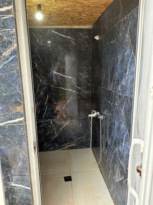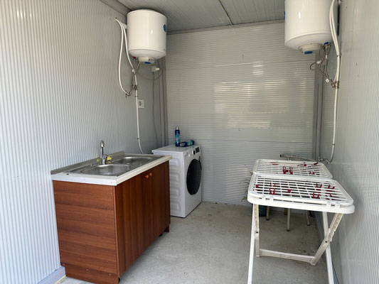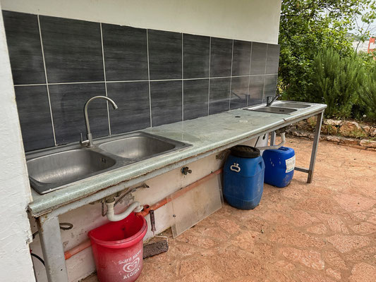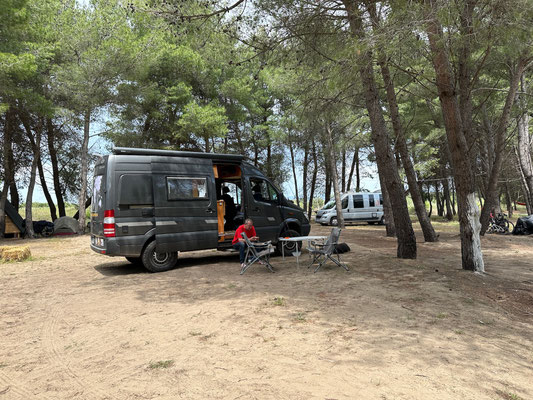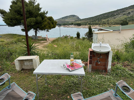 Uns macht das aber nicht wirklich etwas, so leicht rustikalen Charme kennen wir ja schon von unseren anderen Reisen und so wundert es auch nicht wirklich, dass wir am Platz ein Waschbecken auf Backsteinen ohne Wasseranschluss vorfinden. Momentan laufen hier noch die Saisonvorbereitungen und dementsprechend wird der Strand hübsch gemacht, zig Strohsonnenschirme liegen quer, ein LKW bringt neue Steine, ein Bagger quert unseren Weg usw. Uns egal, wir stehen auf Rasen mit Meerblick, wurden sehr freundlich hier begrüßt und aus dem Duschkopf kommt heißes Wasser 🏝🚿