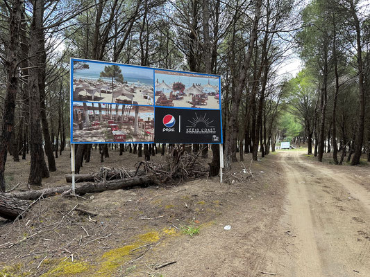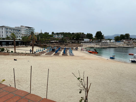Die Bucht mit Kiesstrand ist grob einen Kilometer lang. Aktuell gibt es eine Beachbar, welche zum neugebauten Prado Luxury Hotel nebenan gehört. Schon ein ziemlicher Kontrast zwischen den kleineren Hotelgebäuden am Anfang der Bucht und dem Neubau. Ansonsten gibt es momentan zwei kleinere geöffnete Minimärkte, einige weitere Restaurants und das war es. Die anderen Campingplätze, welche hier unten liegen sollen, haben noch nicht geöffnet.