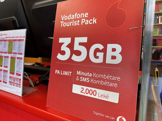 Im Touristenort Ksamil angekommen geht’s somit direkt zum ersten Geldautomaten und dann zum Vodafone Shop. In letzterem wird netterweise Englisch gesprochen und wir kaufen und zwei SIM-Karten, welche nach rund 30 Minuten aktiv sind. Als erstes laden wir uns dann noch die albanische Vodafone App herunter, darin sehen wir dann nicht unseren Datenverbrauch, sondern bekommen wir die Registrierung auch noch 10 GB extra Datenvolumen. Damit sollten wir unterwegs hinkommen. Angeblich sollten unsere Karten auch noch Balkan Roaming können, d.h. in den benachbarten Ländern funktionieren, im Verlauf der Reise hat sich das aber nicht bestätigt.
