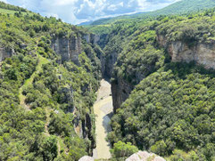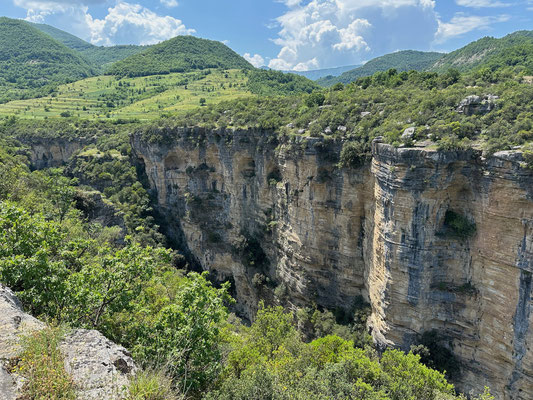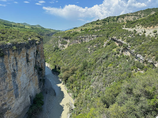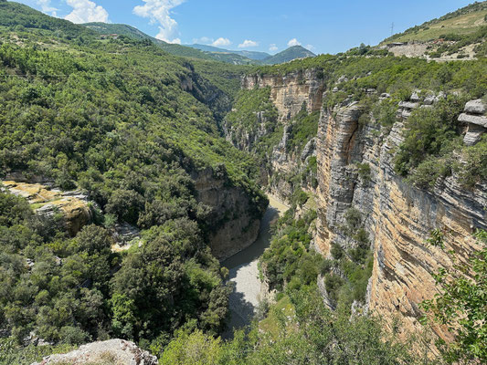 Wir starten heute gen Süden und folgen der schmalen Landstraße zur Osum Schlucht. Vorbei an kleinen Ortschaften, bergauf, bergab, immer mit tollem Blick in die Berge. Für die 70 Kilometer zum ersten Aussichtspunkt in die Schlucht brauchen wir bei gemütlicher Fahrweise rund 2,5 Stunden. Klingt jetzt nicht wirklich schnell, aber das Fahren macht uns hier übrigens wirklich Freude. Der Blick in die Schlucht ist phänomenal, lohnt sich. Wir halten direkt an mehreren Stellen und gucken in die Tiefe. Wer mag, kann hier auch Rafting Touren buchen und von oben sehen die Boote winzig aus.