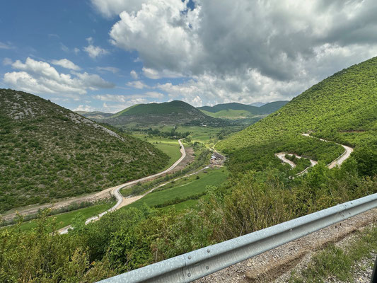 Nach einem netten Abend auf dem Burg Camping machen wir uns heute erneut auf den Weg zu den Thermalquellen Llixhat e Bënjës (Lage GoogleMaps). Diesmal „außenrum“. Wir fahren entspannte 200 Kilometer quer durch die hübsche Bergwelt, zunächst folgen wir der gut ausgebauten Autobahn und danach einer passablen Landstraße. Hübsch ist’s hier.