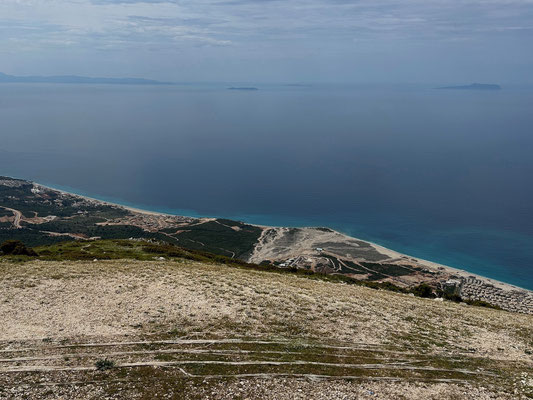 Nach diesem netten Aufenthalt auf Camping Kranea fahren wir heute weiter gen Norden. Auf geht’s über die Küstenstraße SH8 nach Vlora, welche erstens sehr hübsch zu fahren ist und zweitens über den Llagora Pass führt. Bis zum Aussichtspunkt, der noch vor der Passhöhe liegt, sind es zwar nur fünf Kehren, aber innerhalb kürzester Zeit befinden wir uns zig Meter weiter oben und genießen die Aussicht auf das Meer. Ein wenig schwindelfrei sollten Fahrer und Beifahrer allerdings sein, abseits der Straße geht es spektakulär in die Tiefe. Wie wir später bei Wikipedia lesen, liegen zwischen Passhöhe und Küste drei Kilometer und glatte 1000 Höhenmeter. So fühlte sich das auch an.