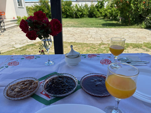 Hier in Berat klettern übrigens die Temperaturen tatsächlich mal auf über 25°C, bereits morgens ist es ungewohnt heiß für uns. Nachdem gestern Abend noch einige weiter Womos angekommen sind, scheint die Frühstücksplanung bzw. -reihenfolge ein wenig durcheinandergekommen zu sein. Macht nichts, wir sitzen gemütlich im Gras in Nikos Garten und warten einfach bis wir dran sind. Nur gut, dass wir nicht zu den ganz frühen Frühstücker gehören. Lecker war es auf jeden Fall! Frischer Orangensaft, leckere Marmelade, warmes Gebäck, da ist für jeden etwas dabei.