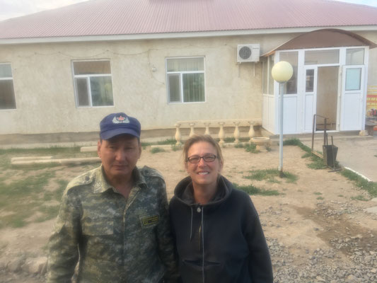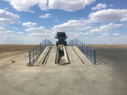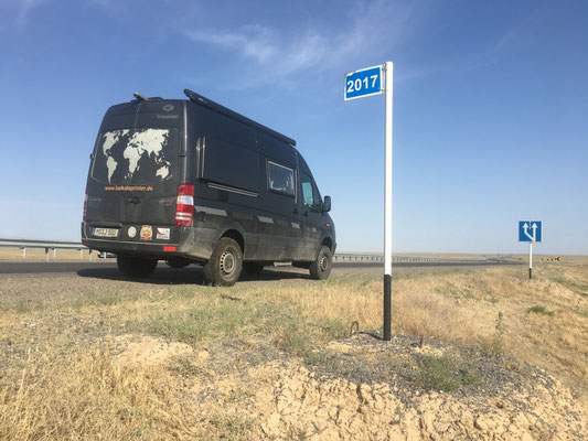 Ich will es kurz halten, nach drei Stunden waren wir wieder auf der neuen Zufahrt zum Grenzübergang. Zwischendurch war Jens für eine halbe Stunde in Uzbekistan eingereist, ich laut Stempel im Pass ebenfalls aber unser Wohnmobil und Vanja nicht. Den Usbeken ist bei der Zollabfertigung irgendwann aufgefallen, dass wir ja ein Fahrzeug der Kategorie „D“ sind und diese an dieser Grenze nicht rüberkommen. Das steht ja schon in unserem Fahrzeugschein, hier ist ja hinter der Herstellerbezeichnung Daimler ein „D“ eingetragen. Nicht dass das „D“ auch für Deutschland stehen könnte. Nein, das steht ganz klar für die usbekische Fahrzeugkategorie „D“. Es ist ja nicht so, dass hier die Hölle losgewesen wäre und man schon mal übersehen kann, welche Fahrzeuge gerade in der Abfertigung stehen. Wir waren allein. Vielleicht hätten wir anbieten müssen eine „Strafe“ zu bezahlen, aber das ist ja nicht so unser Ding. Nur gut, dass wir uns beim usbekischen Visum für die teurere Variante mit mehrfacher Einreise entschieden haben. Bei einfacher Einreise wäre es jetzt vorbei mit unserem Ausflug nach Uzbekistan gewesen. Die kasachischen Grenzbeamten, welche deutlich freundlicher als die Usbeken waren, sind etwas irritiert uns so schnell wieder zu sehen, wir ja ebenfalls, aber so wissen wir ja schon welches Grenzhäuschen wo ist.
