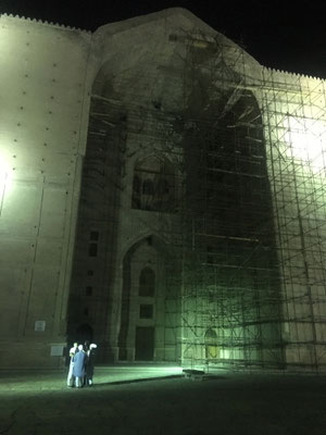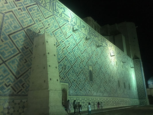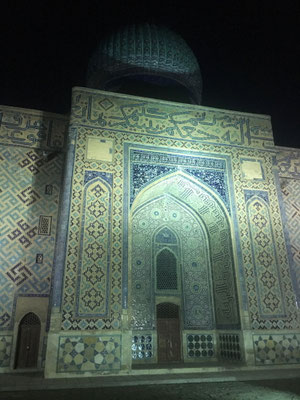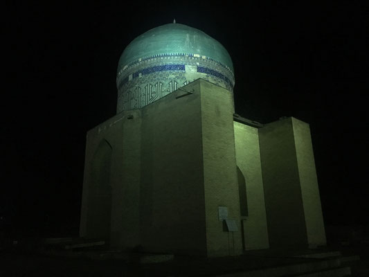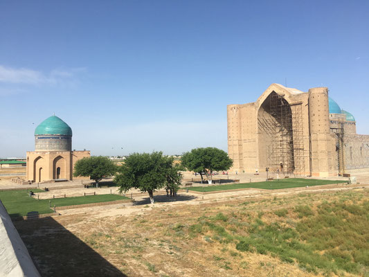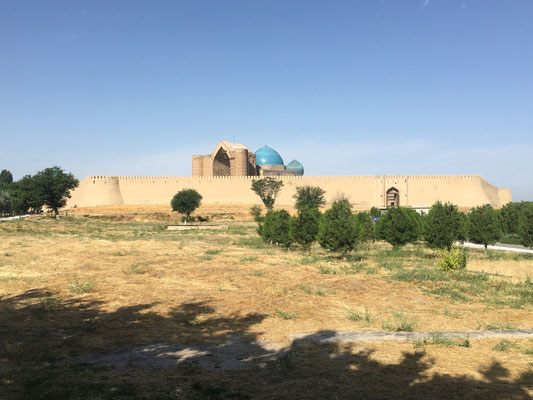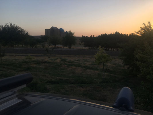 Abends erreichen wir die Stadt Turkistan, welche in ganz Kasachstan bekannt ist für die große Grabmoschee Hodzha Achmed Jassawi. Für die 750 km Fahrt hierhin haben wir rund zehn Stunden gebraucht, eindeutig ein Zeitraum der nur bei gut ausgebauter Asphaltstrecke realisierbar ist. In Turkistan stellen wir uns auf den PKW-Parkplatz an der Grabmoschee und dürfen nach kurzer Frage bei den Wachleuten auch übernachten. Super Parkplatz und durch die Bäume sogar mit Blick auf die Moschee.