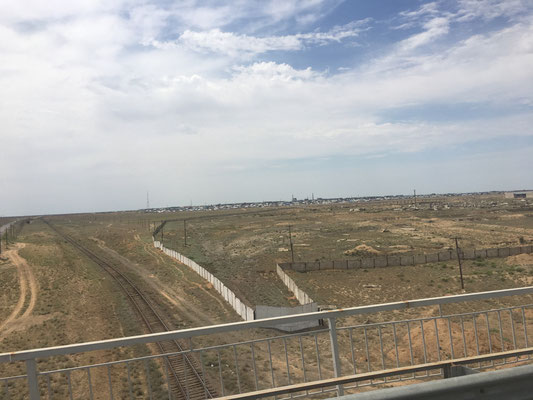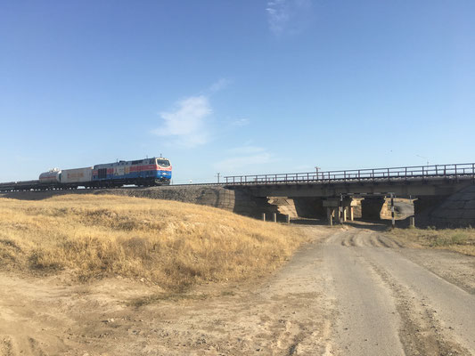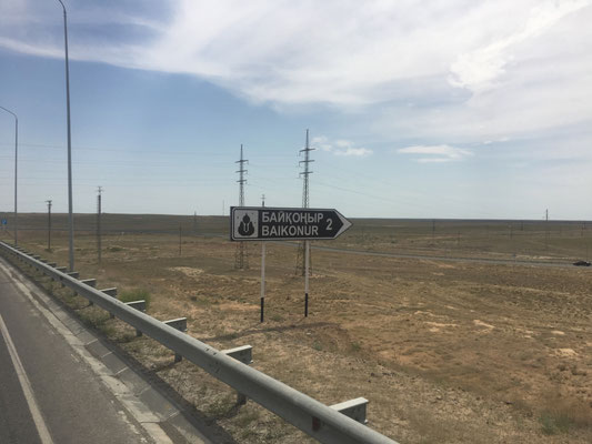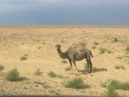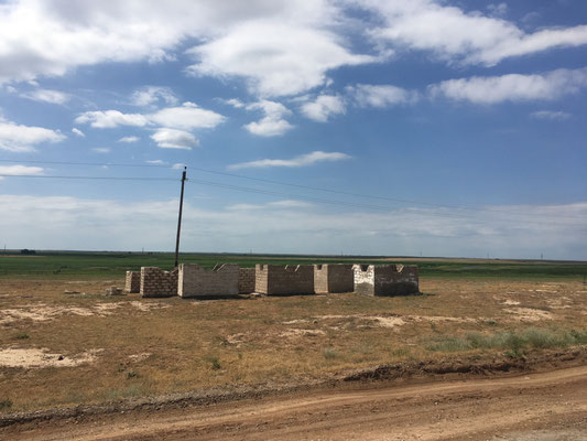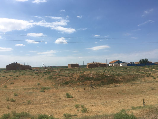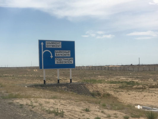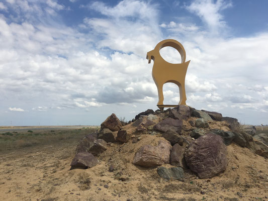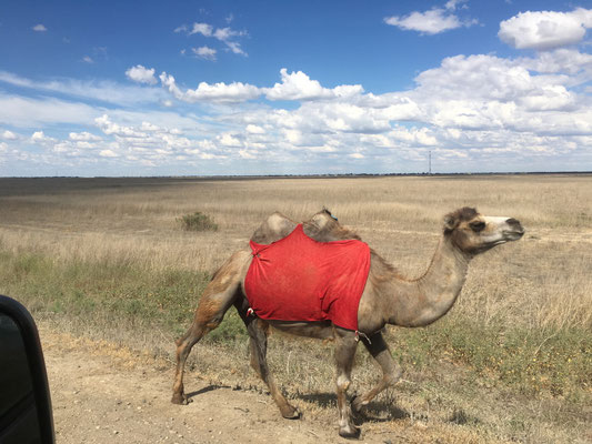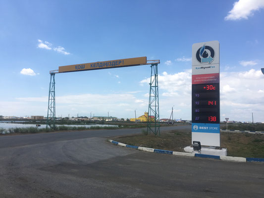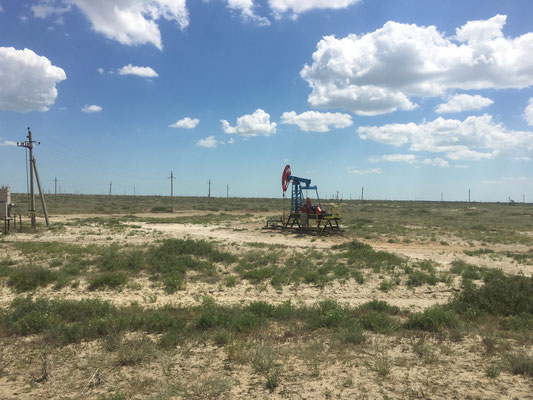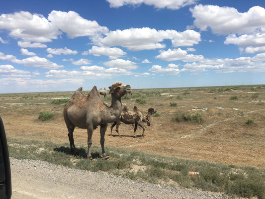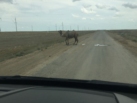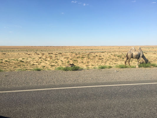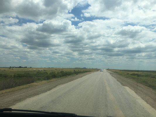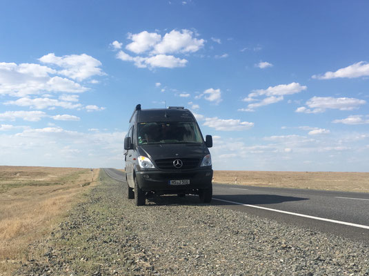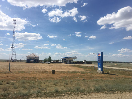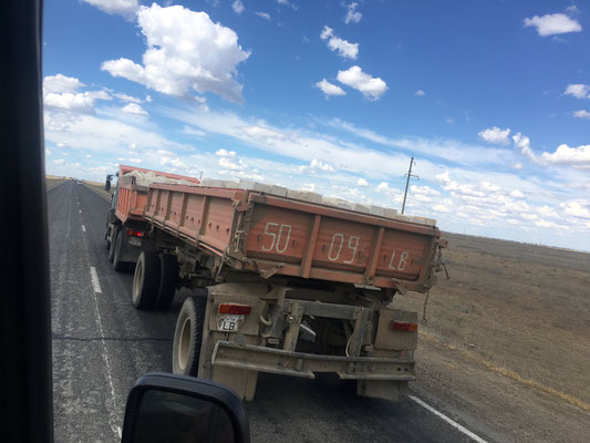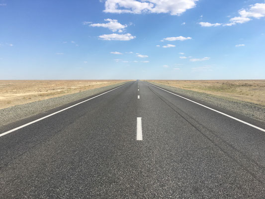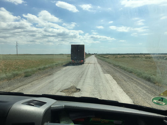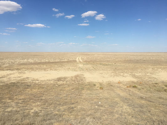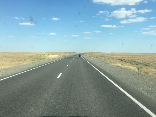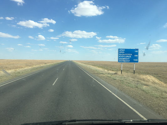 Die nächsten Stunden fahren wir etwas mehr als 600 km geradeaus. Die Landschaft wandelt sich dabei von einer etwas grünlicheren Steppe in eine etwas weniger grünliche Steppe. Die Sicht ist endlos und ab und zu geht es ein wenig rauf und runter. Einsam ist es aber dennoch nicht wirklich, immer mal wieder kommen uns LKWs oder kleinere Fahrzeuge entgegen. Dazu brennt die Sonne von oben auf’s Dach, draußen sind es 36 Grad, und wir sind froh über unsere Klimaanlage. Die Tiere machen sich hier echt rar und die letzte Tankstelle vor Aral liegt davon 280 km entfernt, aber in Aral selbst gibt's natürlich wieder Tankstellen. Die Distanz zwischen diesen war trotzdem ungewöhnlich weit.