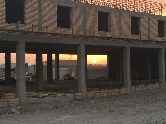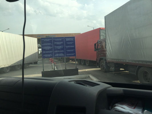 Die Zufahrt zum Grenzübergang Kaplanbek (KZ) / Navoi (UZB) ist neu angelegt, hier wird irgendwie ein großes Autobahnkreuz gebaut. Und dann stehen wir auch schon vor dem ersten Schlagbaum. Mal wieder einen von diesen Grenzübergängen mit Trennung von Fahrer und Passagieren. Also heißt es für Jens aussteigen und für Vanja und mich weiterfahren.