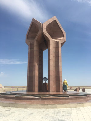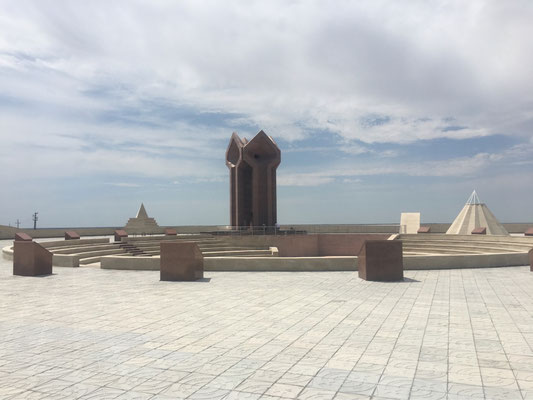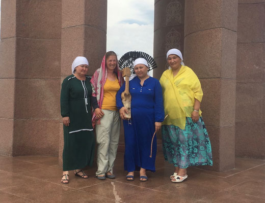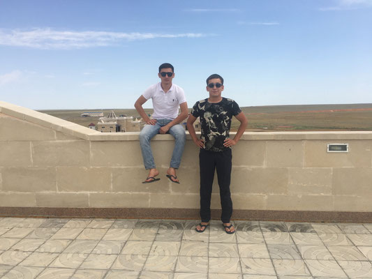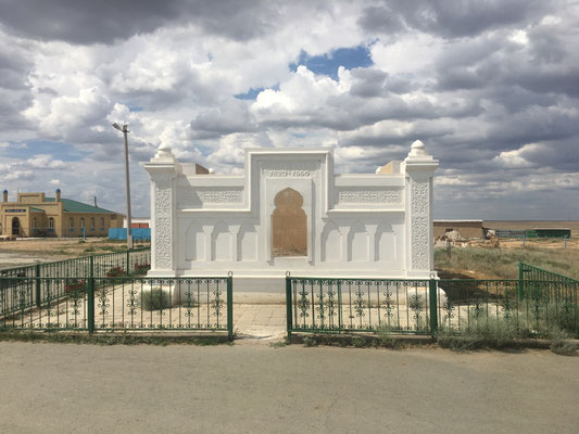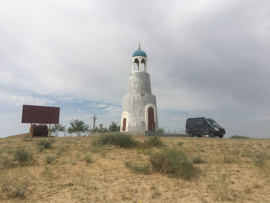 Die gut ausgebaute und von uns seit zig Kilometern liebgewonnene M32 führt uns heute wie erwartet weiter in den Süden. Neben ein paar Kamel- und Pferdeherden gibt es heute zur Abwechslung mal ein paar Denkmäler zu besichtigen. Und dabei sind die ersten mit blauen Kuppeln, welche für uns schon mal ein erstes Zeichen für unsere Annäherung an die Seidenstraße sind. Als Nächstes kommen wir dann noch an Baikonur vorbei, welches wir allerdings nur aus der Ferne sehen denn eine Besichtigung hätten wir vorab als geführte Tour buchen müssen. Spannender ist somit der Besuch des Denkmals für Khorkhyt Ata, einem Philosophen und Musiker aus dem 9. Jahrhundert. Der Legende nach hat er die Kobys, ein hier typisches Streichinstrument erfunden (https://de.wikipedia.org/wiki/Kobys). Und somit wurde ihm auch ein musikalisches Denkmal gesetzt. Wenn der Wind durch dieses weht ertönen leise Töne aus den orgelähnlichen Metallröhren. Eine kasachische Großfamilie aus Shymkent ist gerade gleichzeitig mit ihrem Instrument hier und wir machen ein gemeinsames Foto (zumindest mit den weiblichen Mitgliedern der Familie). Erchan und Asat aus einem näher gelegenen Dorf wollen unbedingt in unserem Blog auftauchen und so mache ich von beiden ebenfalls noch ein Foto.