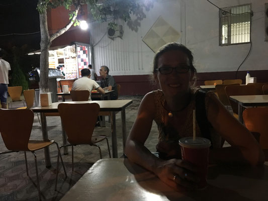 Nun haben wir noch eine klitzekleine Herausforderung zu lösen. Wir brauchen Bargeld und das wechselt man in Usbekistan am besten auf der Straße. Der nahe gelegene Markt ist um kurz vor Mitternacht bereits geschlossen, aber wir finden im nahegelegenen Kiosk jemanden der uns 10 US-Dollar tauscht. Wir bekommen dafür 83.000 Som und können somit beim nächsten Imbiss uns noch einen Abendsnack kaufen. Für 3 Euro bekommen wir hier eine Dönertasche, einen Hamburger und zwei große Cola. Gut gestärkt fallen wir bei immer noch 33 Grad unruhig ins Bett.