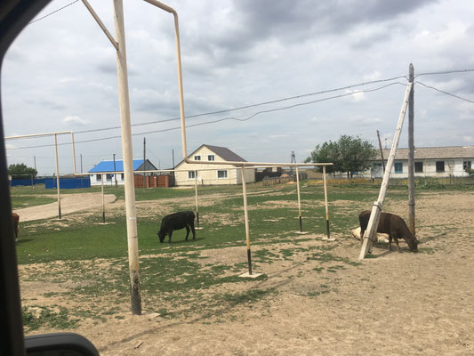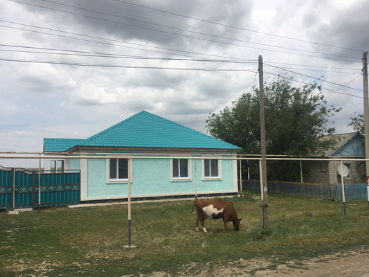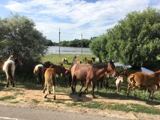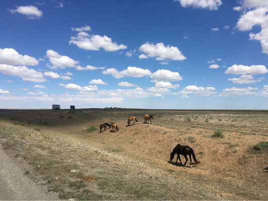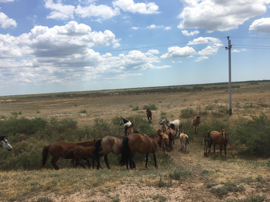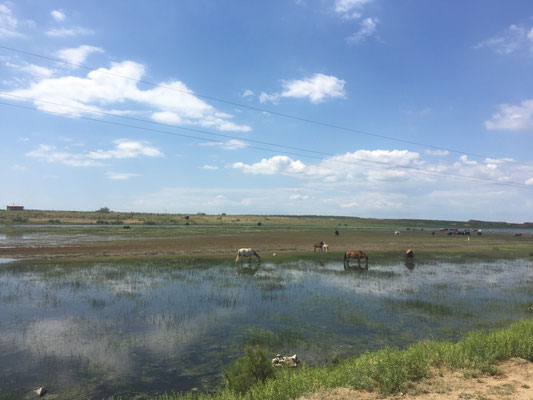 Heute geht’s nach Kasachstan! Raus aus der großen Stadt und erst einmal durch ein Teil des Wolgadeltas. Schön grün und viele Pferde.
