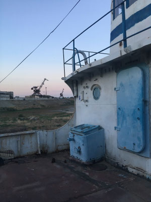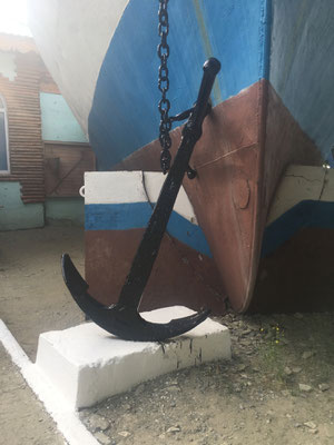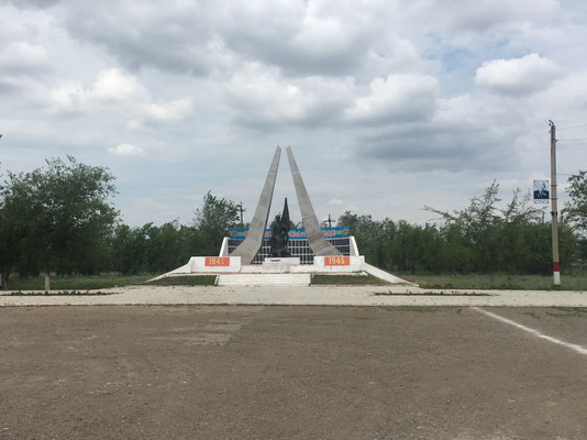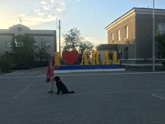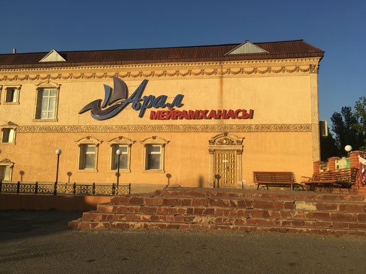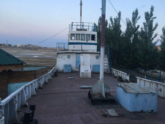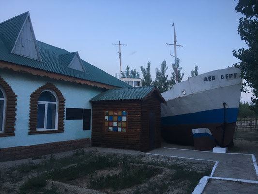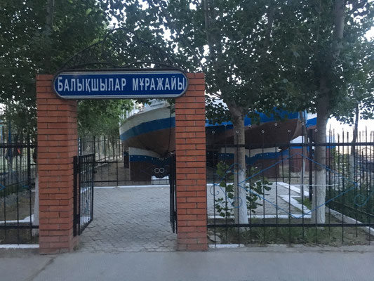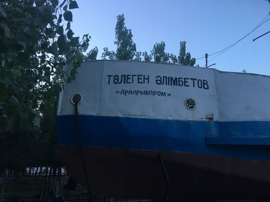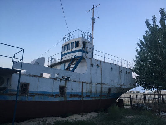 In Aral (russ. Aralsk) angekommen treffen wir erst Tobias, den Motorradfahrer von heute früh wieder und stellen uns dann neben dem Sportclub und dem Restaurant Aral am Straßenrand. Beim Sportclub fragen wir ob wir vor der Tür übernachten dürfen. Klar! Und sofort gibt es erst mal einen kleinen Rundgang durch die grüne Oase im staubigen Aral. Unter Bäumen gibt es hier diverse Fitnessgeräte, ein Fussballplatz und in der Halle ein Kinderschwimmbad und erneut Fitnessgeräte. Cool. Und ich entdecke noch einen Schiffsfriedhof, welcher hier angelegt wurde. Auf den großen Friedhof, der rund 60km südlich von hier liegt verzichten wir aufgrund der Entfernung und dem laut anderen Berichten sehr sandigen letzten Stück. Aber dank der Schiffe hier um die Ecke bekommen wir auch so einen kleinen Eindruck über die Tragödie des Aralsees und seiner Bewohner. Die Vorstellung, dass hier mal Wasser war, ist schon merkwürdig.