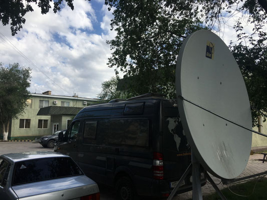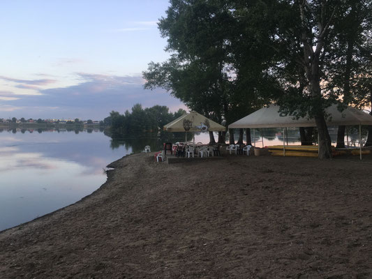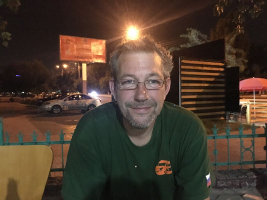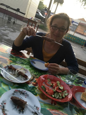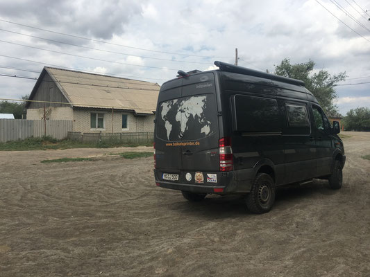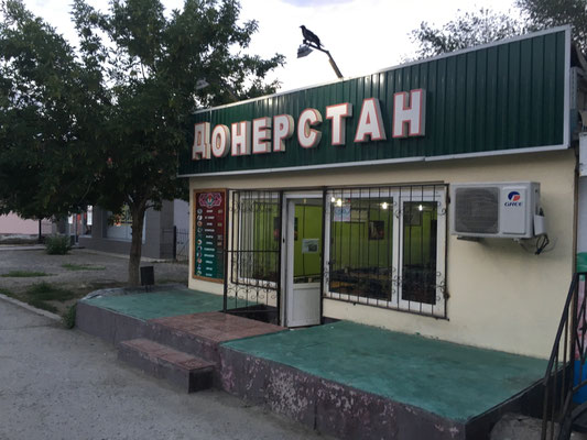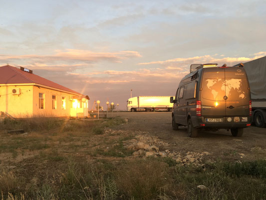 Wir werden direkt in die vorderste Ecke eingewiesen, stehen dabei neben zwei deutschen LKWs (deren Fahrer allerdings nicht deutsch sprechen) und werden neugierig beguckt. So langsam gewöhnen wir uns allerdings an dieses Exoten Dasein und beantworten gerne die typischen Fragen. Dann geht’s erst mal mit Vanja durch die Steppe, für uns noch unter die Dusche und dann ins Lokal. Wie in einer Kantine sind hier die verschiedenen Gerichte ausgestellt. Das macht die Wahl leicht, einfach drauf zeigen. Dann kommt der Teller in die Mikrowelle und schon sitzen wir bei Frikadelle mit Kartoffelbrei und Plov, einem Reisgericht mit Fleisch, zwischen den LKW-Fahrern. Draußen kühlt es über Nacht angenehm ab, so dass wir sehr froh sind hier schön in der Steppe schlafen zu können.