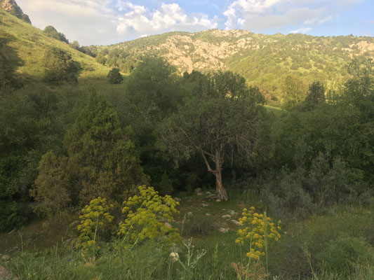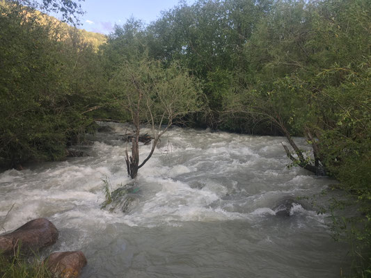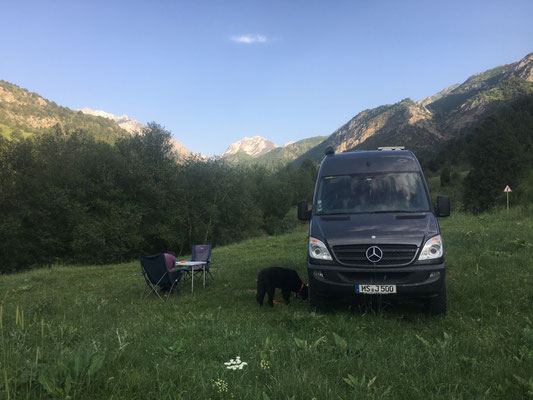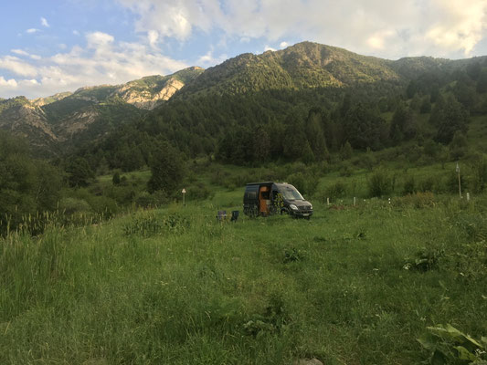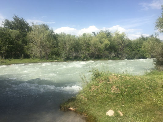 Auf dem Weg nach Kaskasu kommen wir noch durch ein Dorf namens Kasachstan und dann sehen wir auch schon die schneebedeckten Gipfel. Dazu grüne Wiesen und es sieht nicht ansatzweise so aus wie auf den letzten 2000 Kilometern. Hinter dem Dörfchen Kaskasu folgen wir der Straße, die laut der Navi-App Maps.me ganz einfach „Kemping“ heißt bis zum Ende. Und siehe da, wir stehen tatsächlich vor einer Schranke, zahlen 2,50 Euro Eintritt und haben angeblich sechs Kilometer asphaltierte Straße vor uns, wo wir irgendwo übernachten dürfen. So weit fahren wir gar nicht erst, sondern nehmen einfach die erste halbwegs ebene Fläche. Waoh, welch eine Idylle hier! Und dazu so angenehm frisch und der neben uns laut sprudelnde kleine Fluss eiskalt. Einfach nur herrlich!!!