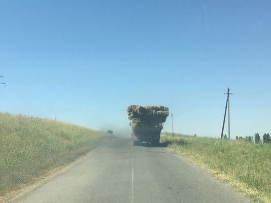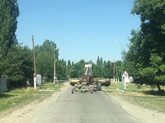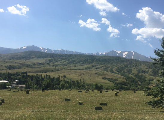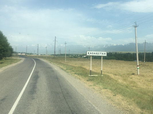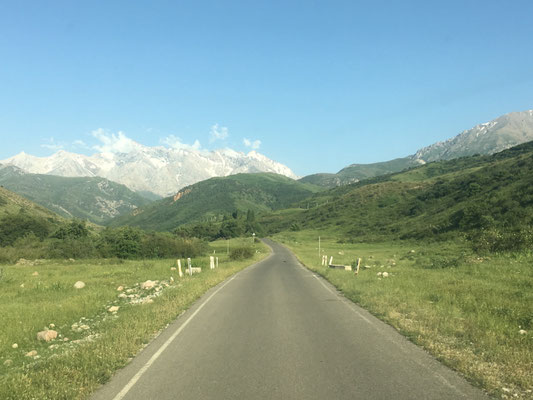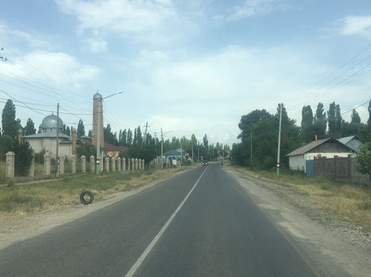 Die Strecke aus den Bergen heraus nach Saryagash zur Grenze ist eher eine Nebenstrecke, immer wieder fahren wir durch kleine Dörfer. Schnell ist anders, dafür ist die Aussicht auf die Berge hübsch und vor allem ist es noch nicht sofort so fürchterlich heiß aber wir nähern uns ja der heißen Steppenebene wieder schön an.