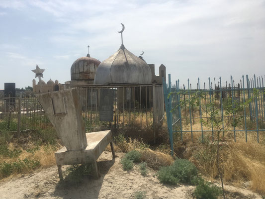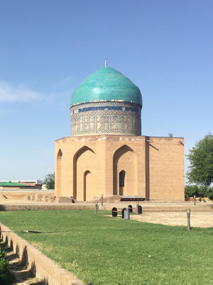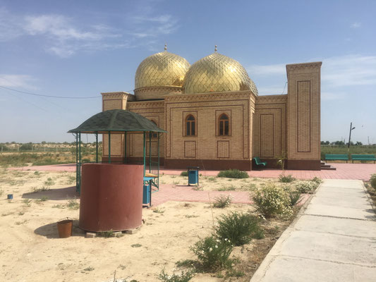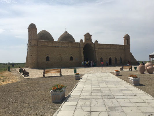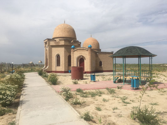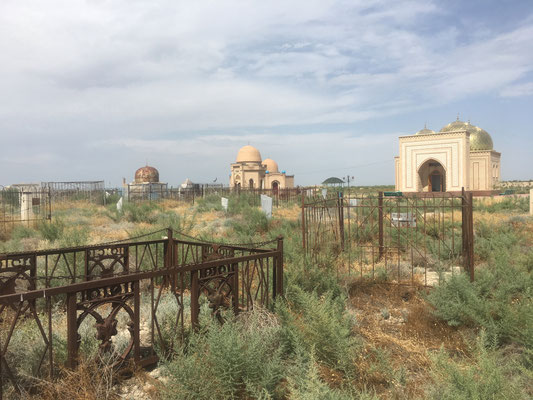 Nach dem Besuch fahren wir nicht zurück zu unserer supadupa Landstraße M32 sondern nehmen eine Nebenstrecke zum rund 60 km entfernten nächsten Pilgerziel, dem Mausoleum von Arystan Bab. Wir holpern also so vor uns hin, sehen einige Grabhügel links und rechts neben der Straße und sind uns dann nicht ganz sicher, ob wir richtig sind. Das Mausoleum sah auf den Fotos irgendwie deutlich größer aus als es in Realität ist. Oder vielleicht war die Erwartung nach dem imposanten Bau in Turkestan auch einfach nur eine andere? An der richtigen Stelle sind wir auf jeden Fall.