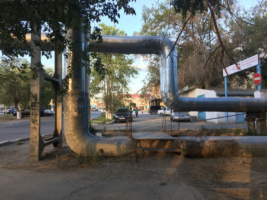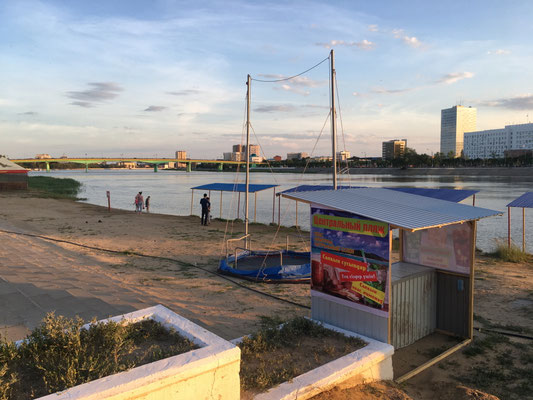In Atyrau, der ersten größeren Stadt auf der Strecke, steuern wir das Greenhotel an und übernachten auf deren Parkplatz. Eine richtig hübsche Stadt ist es nicht, dafür reich an Erdöl wie die Förderpumpen links und rechts der Landstraße vorab schon gezeigt haben. Ein Wohnblock nach dem anderen und wir stehen im Hinterhof eines Hinterhofs. Das Hotel haben wir gewählt um die kasachische Registrierung zu bekommen, was sich allerdings als nicht ganz einfach gestaltet bzw. der Hotelchef uns auf morgen vertröstet. Da haben wir halt keine große Wahl, stellen uns vor seine riesige Satellitenschüssel und machen einen Abendspaziergang zum Fluss. Der Ural teilt die Stadt in einen europäische und eine asiatischen Teil und hier gibt es auch einige Schaschlikbuden, leider nicht mit Hund. Dafür holen wir uns dann bei Dönerstan einen Hähnchendöner. Lecker.