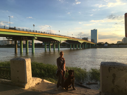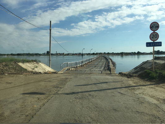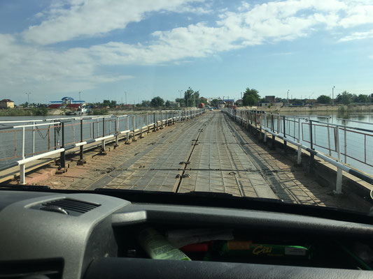 Und wir fahren das erste Mal in unserem Leben über eine Pontonbrücke. Unter uns quietscht und knarzt es, aber sie hält (Preis 170 Rubel).