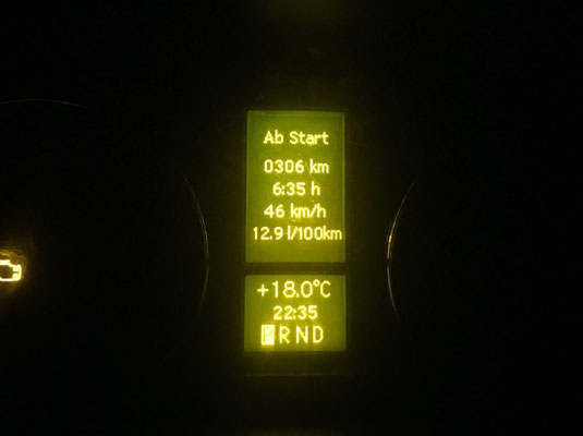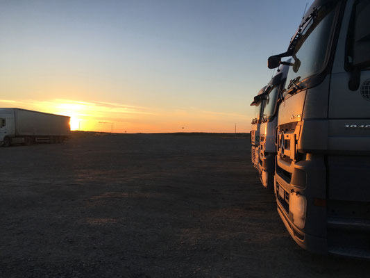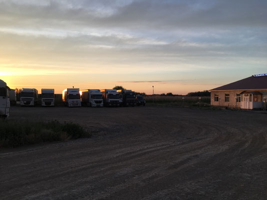 Dämmerung ist immer ein gutes Zeichen dafür sich einen Übernachtungsplatz zu suchen. Alle 50 – 100 Kilometer liegen hier LKW-Parkplätze, so dass wir einfach mal auf so einem übernachten. Netterweise heißt dieser auch noch Transit. Das passt ja!