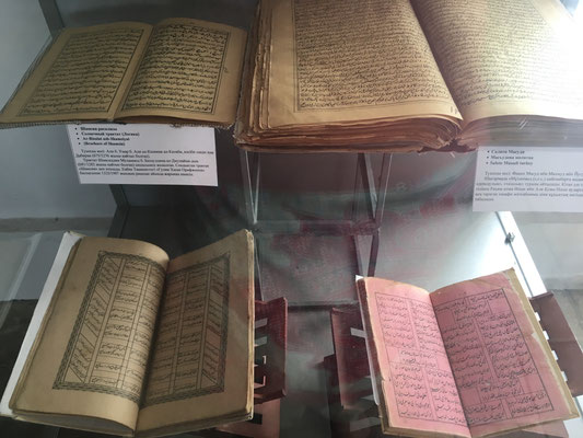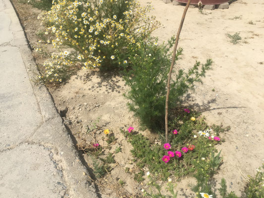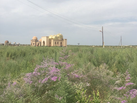 Im Mausoleum selbst ist einerseits der Sarg von Arystan Bab zu sehen und in einem Nebenraum sind alte Korane ausgestellt (bei weiterem Interesse siehe auch hier https://en.wikipedia.org/wiki/Arystan_Bab_Mausoleum). Ringsherum befinden sich noch zwei kleinere Moscheen und ein Friedhof mit interessanten Grabmahlen. Und für alle die uns fragen, ob hier auch etwas anderes als Gräser wachsen, ja es gibt auch ein paar bunte Farbtupfer zwischendurch.