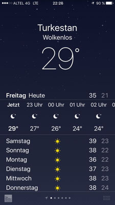 Weiter geht es nach Shymkent, wofür wir doch lieber wieder zurück zur M32 fahren anstatt die angeblich auch ganz schöne Nebenstrecke zu nehmen. Eigentlich hatten wir uns ja überlegt hier in der Stadt zu übernachten, inzwischen haben wir allerdings doch über 40°C draußen. Unser Womo meinte allerdings zwischenzeitlich über zehn Grad mehr anzuzeigen, eindeutig ein Zeichen dass ihm auch zu warm ist. Und so tanken wir nur, kaufen recht großzügig ein und machen uns auf die Fahrt in die Berge. Da wird es bestimmt kühler sein.