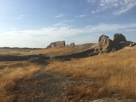 Die nächsten fast 300 km Straße sind allerdings kein Spaß. Das was sich hier Asphalt nennt ist so holprig und hat diverse Verformungen wie es auch schon Andere in ihren Reiseberichten geschrieben haben. Dafür sehen wir bzw. eher nur der Beifahrer die ersten Kamele, Friedhöfe mit interessant anders ausschauenden Gräbern und Lehmhäuser. Dazu noch die bereits bekannten Kühe und Schafe und auch neu ganz viele Pferde! Landschaftlich wirklich reizvoll, allerdings kein Ausgleich für die desaströse Straße.
