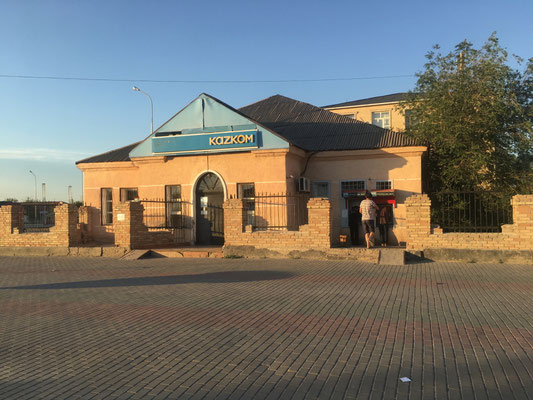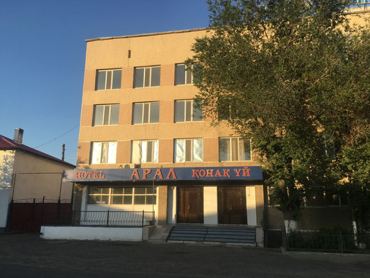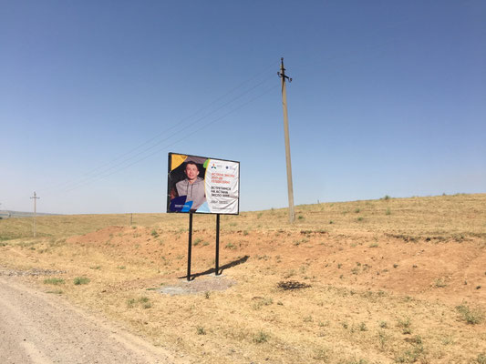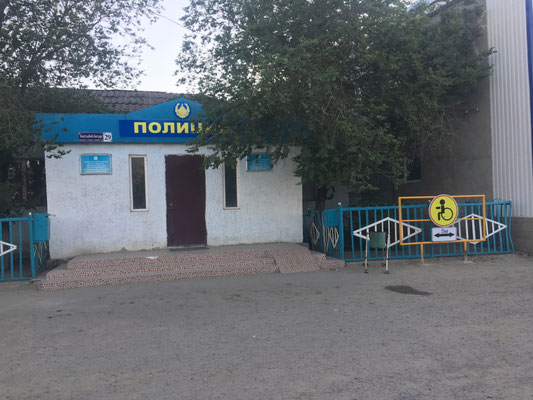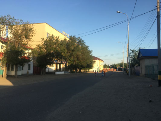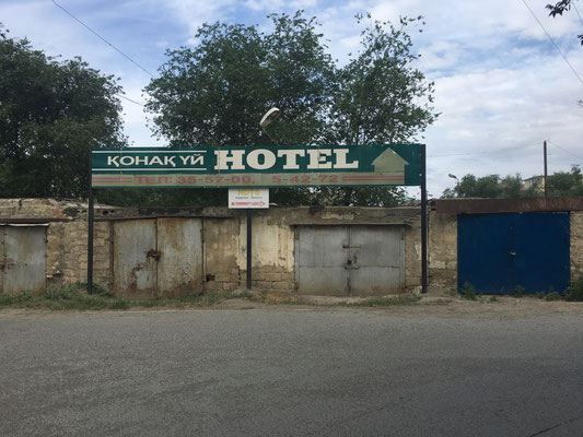 Die Nacht war recht unentspannt, denn es war sehr heiß uns es waren sehr viele Mücken unterwegs. Wir sind also ziemlich gerädert und der Hotelchef zur Bezahlung und für unsere Registrierung noch nicht da. Die beiden Rezeptionsdamen vertrösten uns, erst eine halbe Stunde, dann bis 9 Uhr, dann sollen wir einfach so warten. Dann ist der Chef da, muss aber noch überlegen was wir bezahlen sollen und wir warten wieder. So geht dies rund zwei Stunden bis wir dann mit der Adresse der Migrationspolizei und ohne etwas für die Nacht bezahlen zu müssen abfahren dürfen. Zum Schluss war der Chef sogar recht nett. Dennoch irgendwie merkwürdig hier. Aber dies geht so weiter, denn registrieren ist nicht so einfach. Bei an die 35 Grad versuchen wir unser bestes, werden von A nach B geschickt und geben dann auf. Unsere Stimmung ist recht weit unten und so langsam kommen doch Zweifel auf, ob diese Reise so eine gute Idee war. Dazu kommt noch, dass wir erst in fünf Tagen nach Uzbekistan einreisen dürfen und nur noch 500 km vor uns haben. Und mitten im Nichts stehen und wie andere einfach mehrere Tage vor der Grenze abwarten ist nicht so unser Ding. Wir planen also um und fahren nun auf kasachischer Seite schon einmal weiter in den Süden.