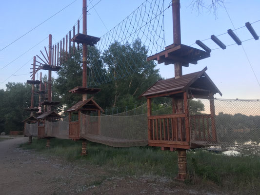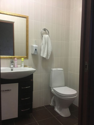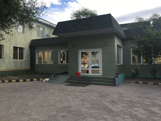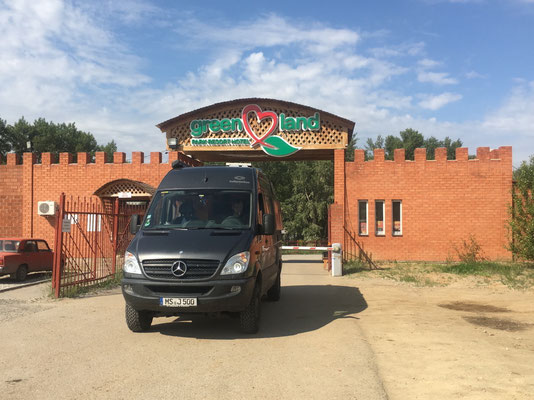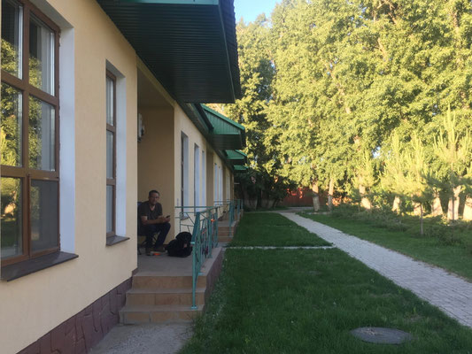 In Aktöbe haben wir uns ein etwas außerhalb gelegenen Bungalowkomplex namens Greenland zur Übernachtung rausgesucht. Überraschenderweise sind tatsächlich Hunde erlaubt und so buchen wir uns für die Nacht hier ein Zimmer. Unser Appartement ist im Vergleich zu unserem Womo unglaublich groß, dazu haben wir eine Terrasse und ein Badezimmer mit Dusche. Super!Die sehr an Centerpark erinnernde Anlage scheint bei Fernreisenden irgendwie nicht unbekannt zu sein und so sind wir nicht die einzigen Touristen aus Europa hier.