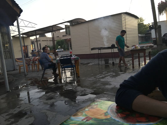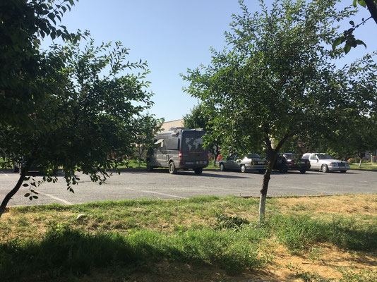 In Taschkent angekommen fahren wir sofort zum B&B Sunrise Caravan Stay, einem im Zentrum gelegenen Hostel, welches wir vorher angeschrieben haben. Es liegt mitten in einem Wohngebiet und wir sind sehr erleichtert, dass wir genau auf einen der überdachten Parkplätze passen. Viel höher dürfte unser Wohnmobil nicht sein.