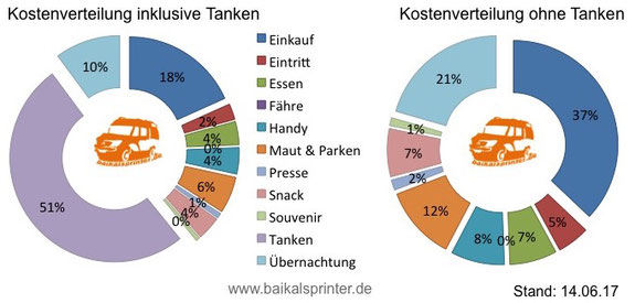 Bei unseren Reisen, insbesondere bei den längeren, versuchen wir immer einen gewissen Überblick über unsere bisherigen Ausgaben zu behalten und führen somit ein Haushaltsbuch. Wie erwartet geben wir quasi genau die Hälfte für Diesel aus. Nur gut, dass dieser inzwischen deutlich günstiger als bei uns zu Hause ist.